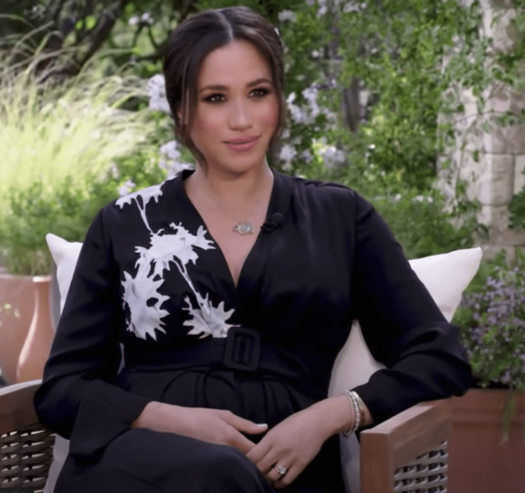 So a middling actress, who at 36 married her prince charming, 6th in line for the English throne, a grandson of Queen Elizabeth II, chafed under the obligations of being part of a royal family, abandoned England for a secluded, luxurious $14.65 million, 7.4-acre Montecito, California estate, cried out for privacy, publicized in a New York Times essay that she had miscarried her second child with Prince Harry, sat down for a spectacle of shameless self-promotion wearing a $4,700 black, triple silk georgette dress design by Giorgio Armani with $695 spiky black Aquazzura pumps in front of television cameras before 17 million members of the grubby public with her billionaire neighbor, Oprah Winfrey…and complained about her suffering.